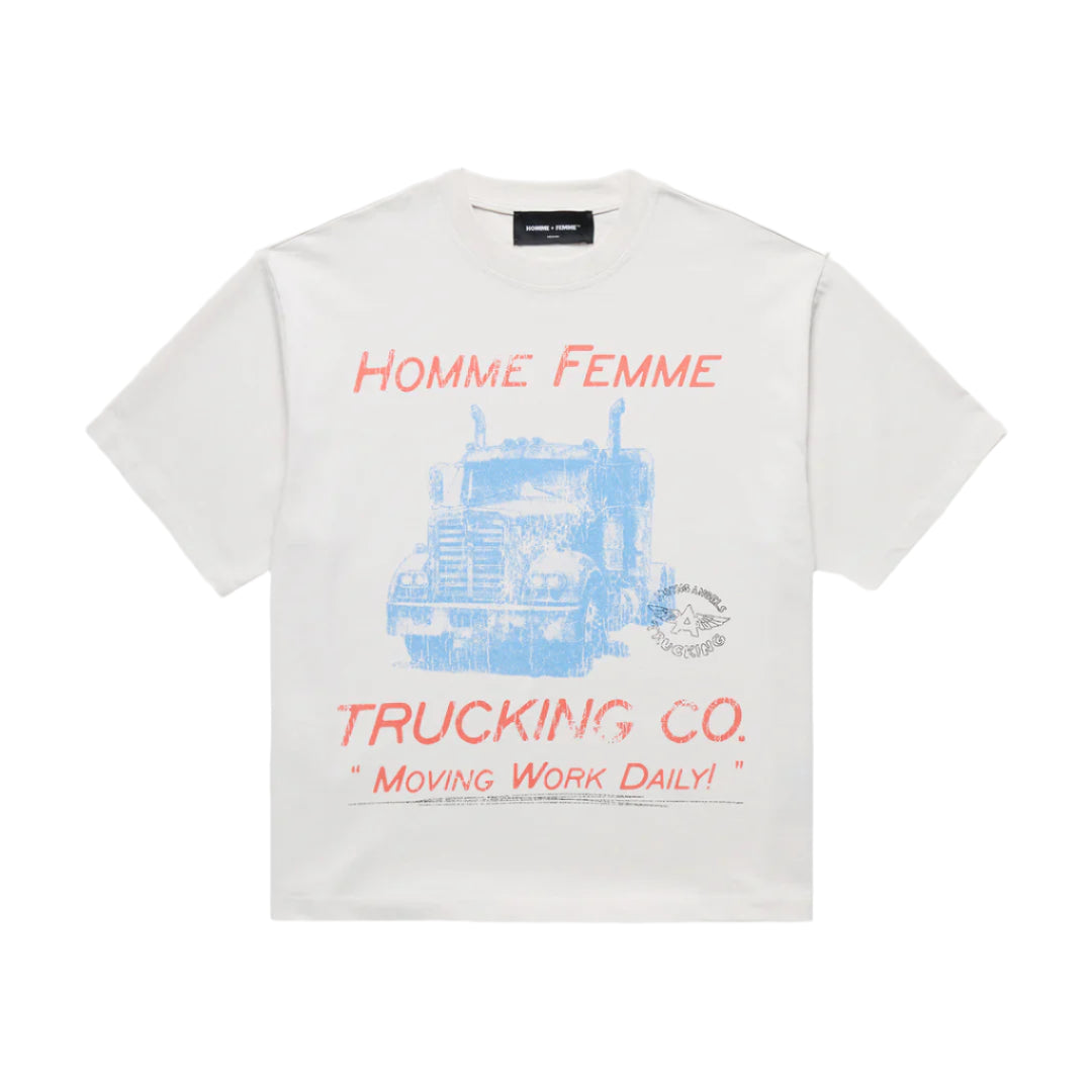 The Trucking Co. Tee is a luxe tribute to the working-class grit that built America’s backbone. Featuring a distressed big-rig graphic and bold HOMME Femme insignia, it nods to the legacy of long-haul drivers who carved paths through the Great American Desert—from Kansas to Texas and beyond.