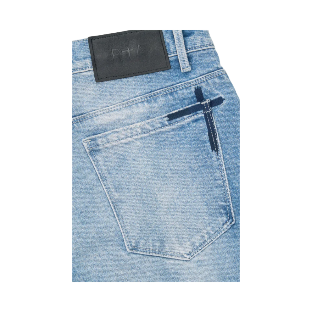 The Bryant Skinny Jean in Faded Blue is made from premium denim. Designed with a slim fit and reinforced stitching on the inner thighs. These jeans feature the "RTA" logo embroidered on the leg, the iconic RTA cross on the back pocket, and signature leather patch on the back waistband.